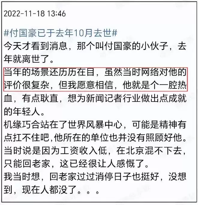 网络终归是有记忆的,看到留几手如此毫无底线的评价逝者,有网友想起了他曾对爱国者付国豪的评价。当年付国豪被歹徒围殴侮辱,留几手嘲讽付国豪为版面博出位。当付国豪去世消息公开后,他又用“网络对他的评价很复杂”岁月史书,明明当年的舆论方向都是谴责暴徒,至于付国豪的争议都是类似留几手这样的博主掀起的。