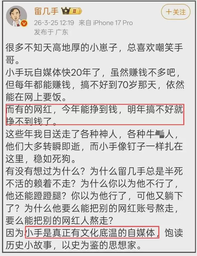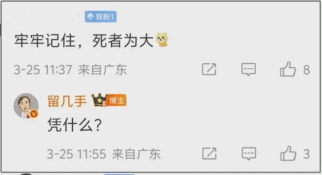事情起因是留几手先发了一条“东北网红数量减一”,评论区网友提醒他要“牢牢记住,死者为大”,他怼道“凭什么”。简单几个字,就看出他对死者欠缺最基本的尊重,并没有意识到自己的行为有多么凉薄。
