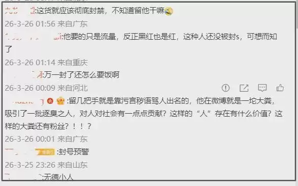 其他网友则表示留几手就应该被彻底封禁,斥责他为了流量不顾一切,本身就是靠口无遮拦骂人出名的,黑红也是红,希望他被封杀。