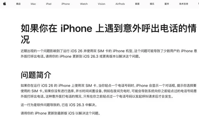 【环球网科技综合报道】3月26日消息,苹果正式于近日发文回应“部分用户遇到意外呼出电话的情况”。苹果公司已确认该故障源于运行早期版本 iOS 26 系统的双 SIM 卡机型,并正式发布软件更新予以修复。最新建议所有受影响用户尽快将设备升级至 iOS 26.3 或更高版本,以消除安全隐患。