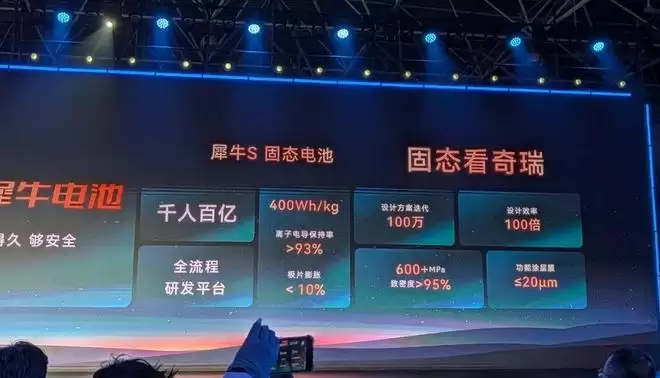 奇瑞犀牛电池:通过-40℃ ~ 60℃全温域验证,低温环境下(-30℃)充电效率≥80%,放电容量保持率≥75%,未公布具体实测充电时长。