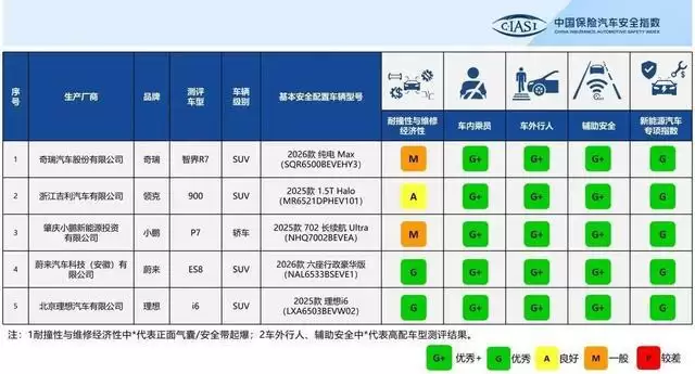 测评显示,耐撞性与维修经济性分指数共有2款车型获评优秀(G)、1款良好(A)、2款一般(M);结构耐撞性方面蔚来ES8获优秀,碰撞兼容性优秀车型为奇瑞智界R7、蔚来ES8、理想i6三款,全部车型低速主动安全均获优秀与加分。