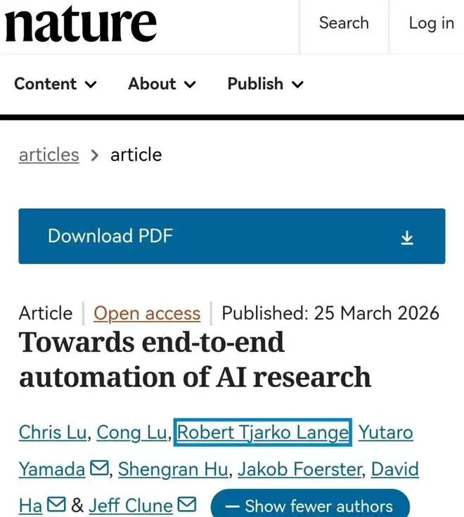 几小时前,Nature 宣布了真正意义上的 AI 科学家的首次实现。由“Transformer 八子”之一联合创办的日本 Sakana AI 与英国牛津大学、英属哥伦比亚大学的研究团队打造了一个从零开始搞科研的 AI,实现了从构思到论文发表的完整端到端自动化,并有 AI 论文通过国际顶会 ICLR 2025 同行评审,这是 AI 科研范式的突破,触及了人类创造力的边界。