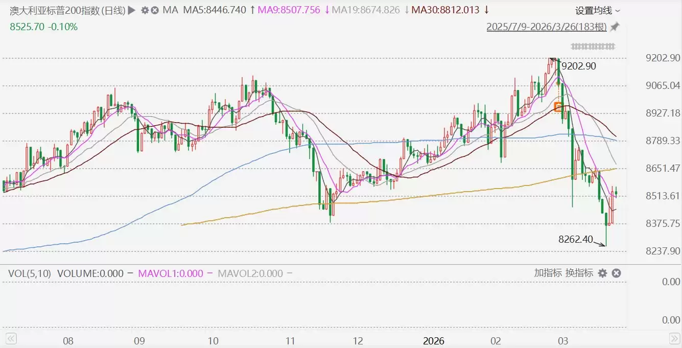 格隆汇3月26日|澳大利亚S&P/ASX200指数收盘下跌8.6点,跌幅0.1%,报8525.7点。