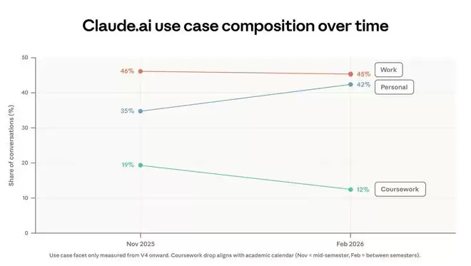 2025 年 11 月和 2026 年 2 月 Claude.ai 的工作、个人及课程使用情况。