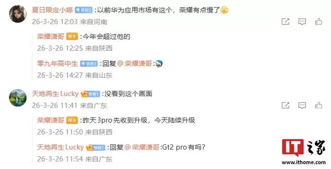 IT之家注意到,@荣耀潇哥 还在评论区与网友展开了互动。有用户表示,以前华为应用市场也有这个 PC 应用专区,称荣耀有点慢。他回复称:“今年会超过他的。”还有用户称没有在平板端看到这个专区,他表示:“昨天 3 Pro 先收到升级,今天陆续升级。”
