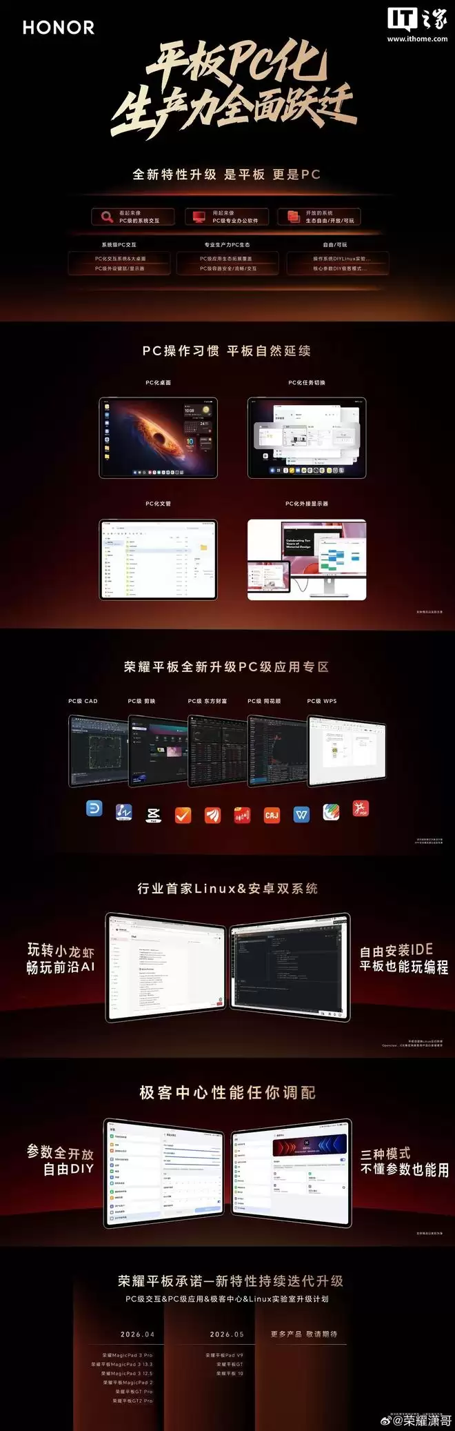 PC 化交互:复刻 PC 桌面操作逻辑,窗口自由拖拽缩放、键鼠全链路原生适配,用过 PC 的人零门槛上手; PC 级应用支持:我们把完整的 PC 端专业应用搬上平板,专业办公、设计创作、数据处理,PC 上能落地的事,荣耀平板一样能给你无差别的体验; 开放 Linux 桌面环境:打破生态壁垒,把系统的主动权还给用户,开放的桌面环境,给开发者、极客玩家们无限想象; 游戏极客模式:全面开放性能参数,极致性能释放、超低延迟操控、大屏专属适配,给玩家最酣畅的沉浸体验。