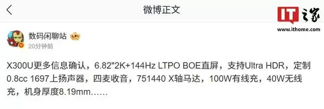 X300U 更多信息确认,6.82"2K+144Hz LTPO BOE 直屏,支持 Ultra HDR,定制 0.8cc 1697 上扬声器,四麦收音,751440 X 轴马达,100W 有线充,40W 无线充,机身厚度 8.19mm……