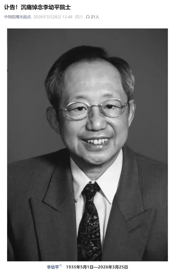 IT之家 3 月 26 日消息,据“中物院曙光视点”公众号今日消息,李幼平同志治丧委员会 3 月 25 日发布讣告,中国工程院院士、电子和通信技术专家、中国工程物理研究院科技委原主任李幼平同志因病医治无效,于 2026 年 3 月 25 日 9 时 5 分在北京大学第三医院逝世,享年 91 岁。