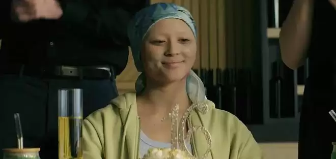 光头,拐杖,一张因为长期服药而苍白的脸,她出现在那群少年中间,像是个老太太。