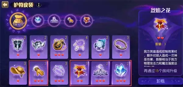 3、护符选择选择如下,第一个是加伤害的,第二个“烈焰之花”在过难度四很重要只要控制就可以额外打出很高的神圣伤害加成很大,天照加烈焰之花伤害就很高了,第三个和第四个是冰龙和冰女的加成护符,在幻书中一般有英雄的加成护符基本都可以优先选用那些英雄。