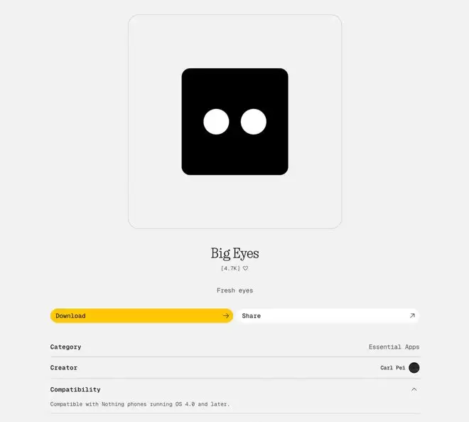 Nothing 创始人 Carl Pei 本人也在 Playground 里发布了一个作品,叫Big Eyes——一对会眨眼的大眼睛,放在你的屏幕上,每隔几秒眨一下,你点它会有反应。没有任何实用功能,就是一对眼睛。