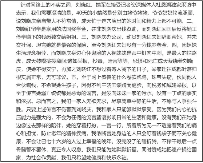 刘晓红通过媒体回应了几点网络传闻,第一,刘晓庆方面多次透露自己在外甥靖然40天大的时候,就接手抚养长大,对此妹妹刘晓红进行了否认,称靖然是被姥爷姥姥和爷爷奶奶轮流照顾,刘晓庆忙于演出根本不可能亲自照顾孩子。第二,刘晓红留学的资金是享用的奖学金,并不是刘晓庆资助,相反刘晓红回国勤工俭学的钱还交给了姐姐刘晓庆。