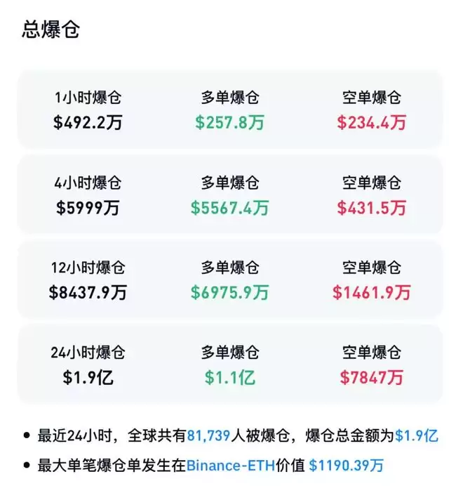 Coinglass数据显示,最近24小时内,加密货币市场超8万人被爆仓,爆仓总金额为1.9亿美元。其中,多单爆仓金额为1.1亿美元,空单爆仓金额为7847万美元。