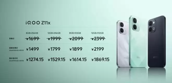 iQOO Z11x提供4个存储版本,8GB+256GB首销价1499元,8GB+512GB首销价1899元,12GB+256GB首销价1799元,12GB+512GB首销价2199元。