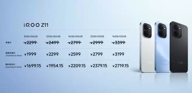 iQOO Z11提供5个存储版本,8GB+256GB首销价1999元,12GB+256GB首销价2299元,12GB+512GB首销价2799 元,16GB+256GB首销价2599元,16GB+512GB首销价3199元。