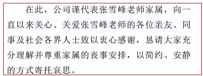 在这条声明的最后,还加上了张雪峰所属公司所编辑的一段话,称“谨代表张雪峰老师家属,向一直以来关心,关爱张雪峰老师的各位亲友,同事及社会各界人 致以衷心感谢,恳请大家充分理解并尊重家属的丧事安排,以简约,安静的方式寄托哀思。”