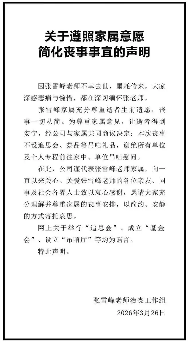 随后治丧工作组再次发布声明,主题围绕张雪峰家人的意愿,这也是他离开后家人首次发声。