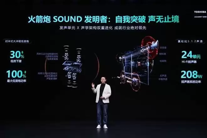 火箭炮SOUND技术平台迎来全新升级,主声道扬声器材料升级为钕磁,低音截止频率优化至90Hz,高音提升至16KHz,行业首推的对冲式大冲程低音炮,让低音下潜至35Hz,功率翻倍,搭配BRα AI音质芯片的8声道独立驱动,实现真杜比5.1.2声道全景声,即便超薄机身也能发出震撼原声。REGZA Intelligence技术的推出,更是精准解决了中国用户的使用痛点,AI画质自适应能根据环境和内容自动调节画质,AI音效自适应可匹配不同内容的音效模式,AI智能桌面和指向遥控器,解决了用户找内容难、操作繁琐的问题,让电视使用更丝滑。这些技术创新的落脚点非常清晰,就是让中国用户在真实的使用场景中感受到方便和舒适。