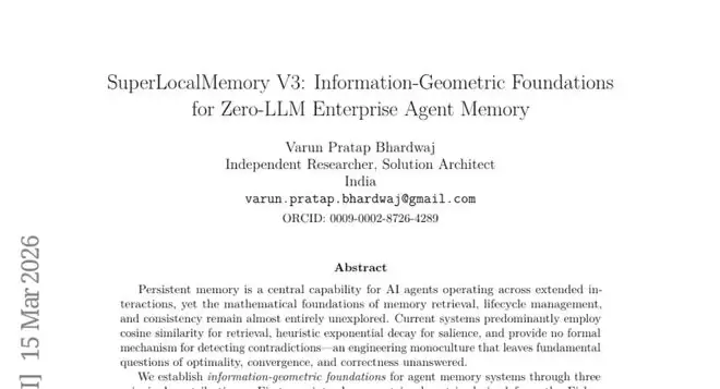 为了解决这个问题,研究者Varun Pratap Bhardwaj开发了一套名为SuperLocalMemory V3(简称SLM-V3)的AI记忆系统。这个系统的独特之处在于,它不是简单地模仿现有的记忆存储方法,而是从数学原理出发,构建了一套完整的理论框架。可以说,这就像是为AI的记忆系统设计了一套"大脑神经网络的数学蓝图"。