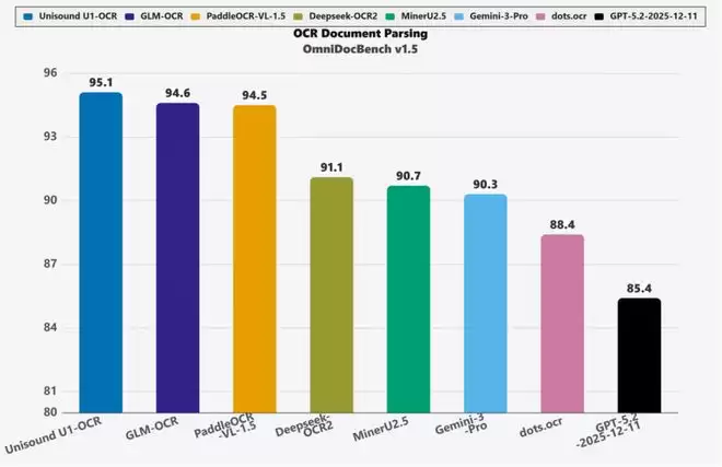 ▲Unisound U1-OCR在OmniDocBench V1.5的评测得分对比