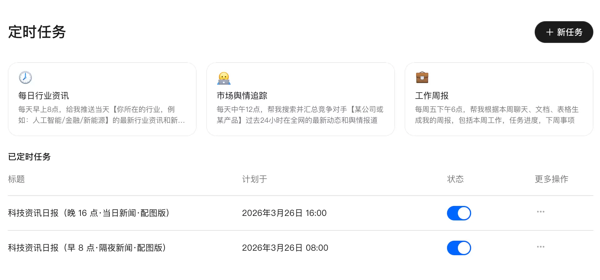我给悟空设定了两套定时任务,每天早 8 点和下午 4 点收集最新的资讯,定时任务准时触发: