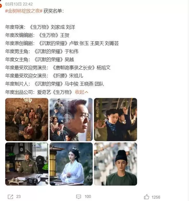 我们可以看到,年度女演员颁给《沉默的荣耀》中的吴越,年度男演员颁给《沉默的荣耀》中的于和伟,也就是说,这一部剧直接包揽两个奖项。