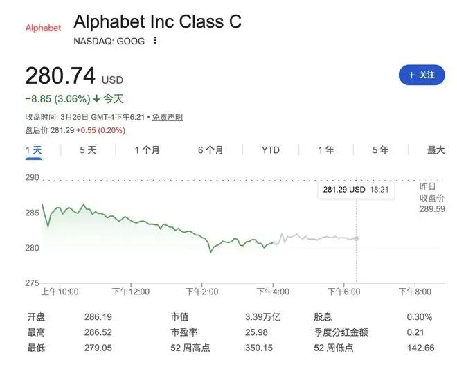 不过,这一消息一度对谷歌股价造成压力,周四盘中触及低点。该股最终收于280.74美元,下跌3%;苹果股价则基本持平,收于252.89美元。