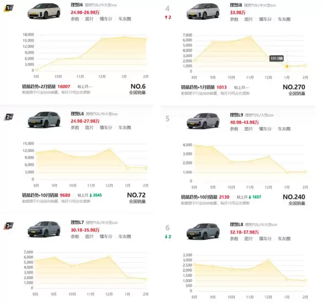 从销量数据来看,L系列销量从2025年下半年以来呈明显下行趋势,且这一趋势在2026年一季度仍在持续。2026年1月-2月的销量数据显示,L6的月销量徘徊在6000辆以下,L7的月销量约2000辆,L8和L9月销量在1000辆出头。