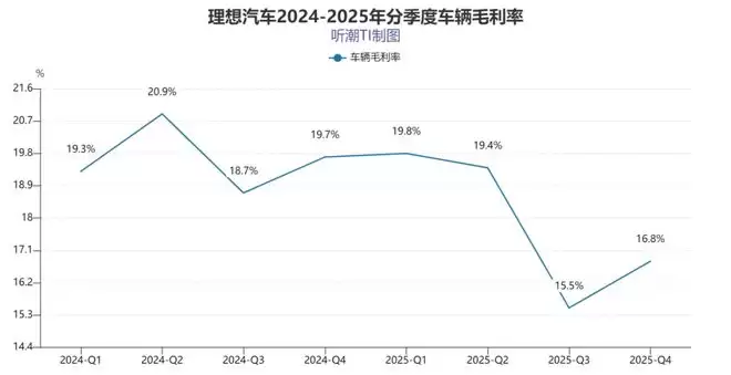 从财务数据上看,理想汽车的车辆毛利率在2025年总体呈持续下滑态势,从一季度的19.8%下滑至四季度的16.8%,最低曾触及三季度的15.5%。