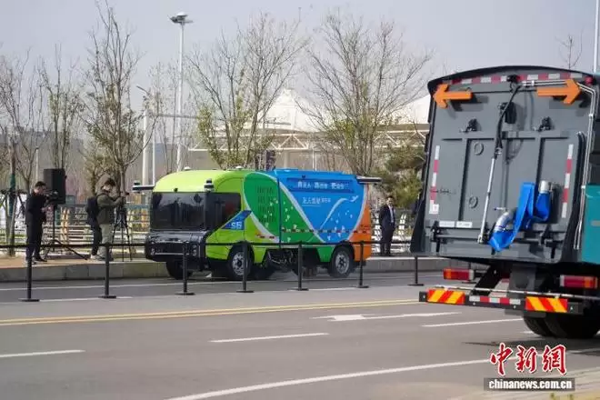 图为L4级自动驾驶洗扫车动态作业演示吸引参观者拍摄。中新社记者 李超庆 摄