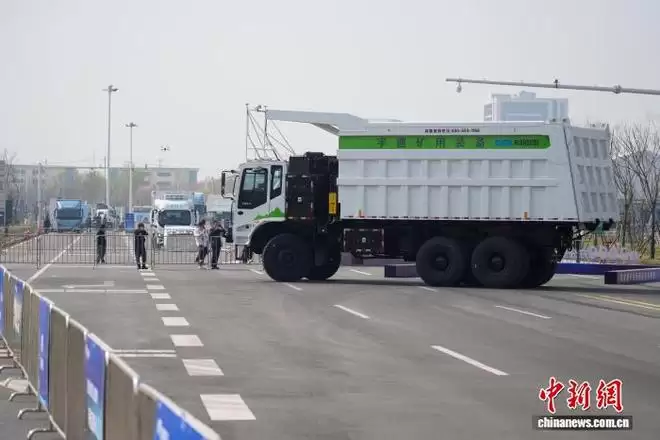 3月26日,位于河南省智能网联汽车测试基地内,L4级无人矿卡、自动驾驶洗扫车等多款新能源商用车集中亮相,吸引关注。图为重卡BSD盲区预警测试演示引围观。中新社记者 李超庆 摄