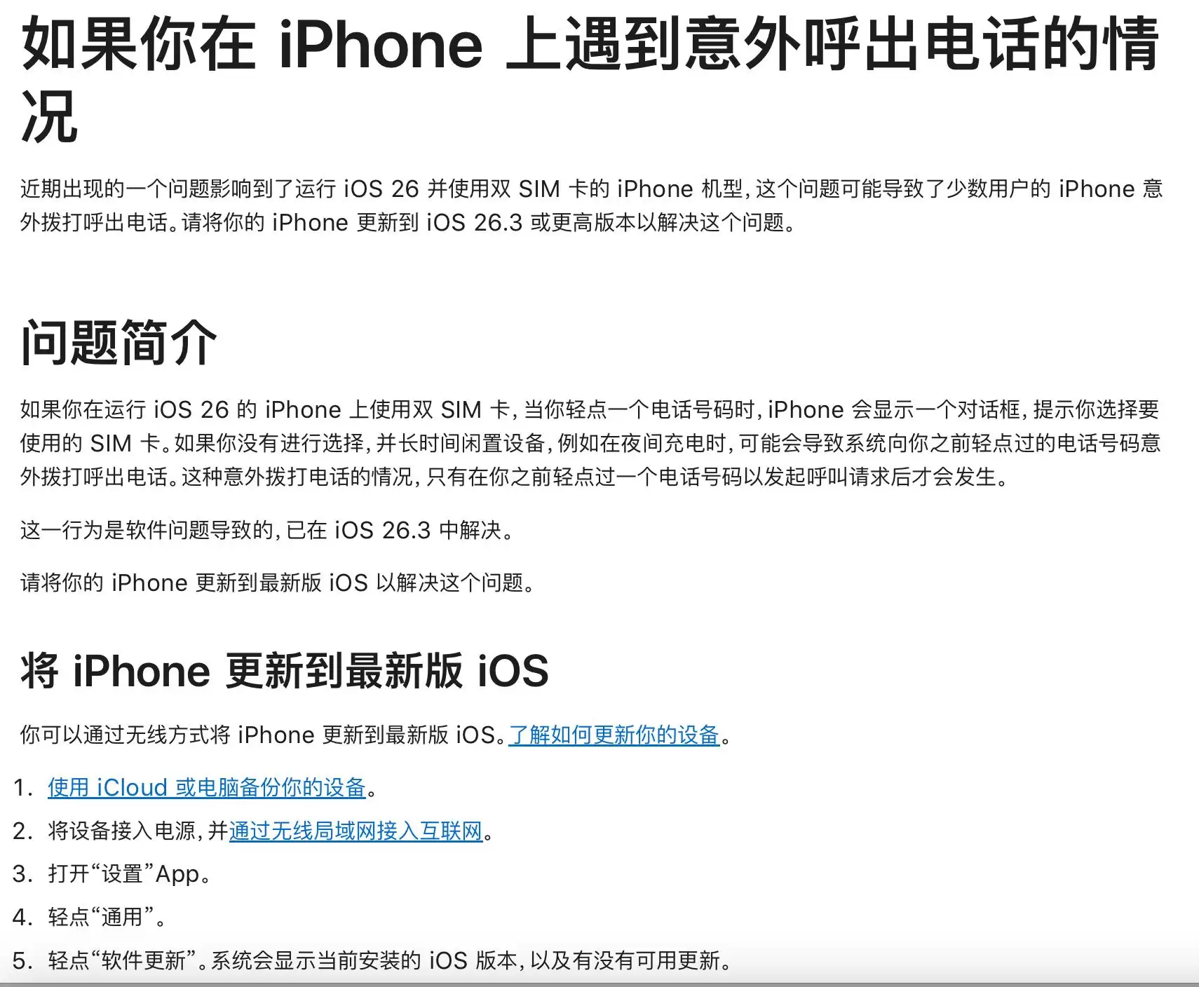 最新详细描述道,如果在运行iOS 26的iPhone上使用双SIM卡,轻点一个电话号码时,iPhone会显示一个对话框,提示选择要使用的SIM卡。如果没有进行选择,并长时间闲置设备,例如在夜间充电时,可能会导致系统向之前轻点过的电话号码拨打电话。这一行为是软件问题导致的,已在iOS26.3中解决。