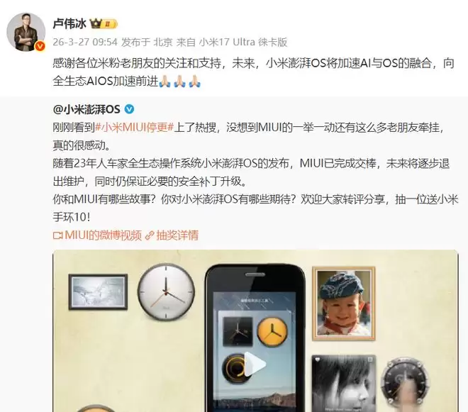 对于MIUI的彻底告别,小米澎湃OS也进行了回应。他们表示:刚刚看到小米MIUI停更上了热搜,没想到MIUI的一举一动还有这么多老朋友牵挂,真的很感动。随着23年人车家全生态操作系统小米澎湃OS的发布,MIUI已完成交棒,未来将逐步退出维护,同时仍保证必要的安全补丁升级。卢伟冰更是表示:感谢各位米粉老朋友的关注和支持,未来,小米澎湃OS将加速AI与OS的融合,向全生态AIOS加速前进。这就是小米的下一步目标,向全生态AIOS加速前进。据行业的信息今年小米一款大会师的产品出现,它是基于小自研芯片、自研操作系统、自研……打造的。