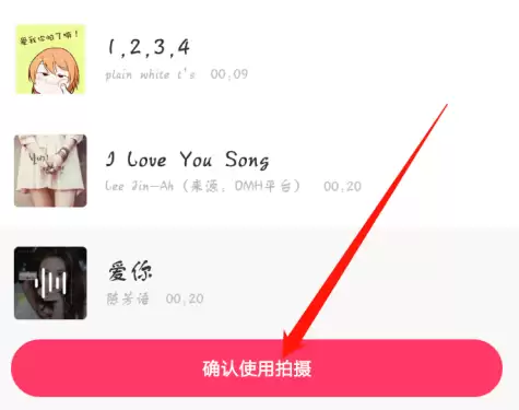 点击了之后,就进入了选择音乐的界面,这里的音乐有几个类型,但是不知道自定义音乐。所以选择自己想要的音乐,点击了之后可以试听,试听之后满意的话就可以点击红色字体【确定使用拍摄】