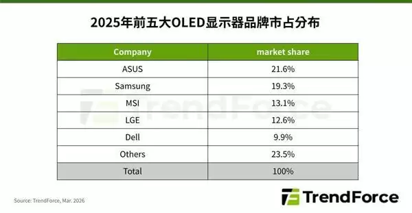 市场格局迎来重大变化,华硕在2025年第三季度超越三星后,持续巩固领先优势,全年以21.6%的市占率夺得全球第一。