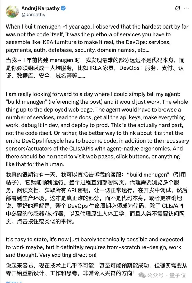 聊到这次一波三折的菜单项目,卡帕西自己也忍不住总结了一句: