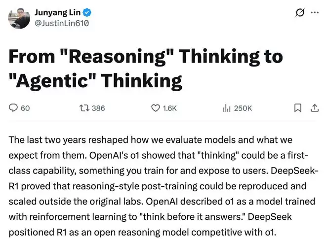 智东西3月27日报道,昨日晚间,前阿里千问大模型负责人林俊旸(Junyang Lin)在社交平台X上发表了《从“推理式思考”到“智能体式思考”(From “Reasoning” Thinking to “Agentic” Thinking)》的长文,引起AI技术产业圈关注。