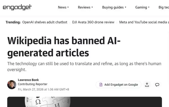 【环球网科技综合报道】3月27日消息,据Engadget报道,英文版维基百科近日宣布更新编辑规则,明确禁止编辑人员使用人工智能直接撰写或重写百科条目,不过并未完全禁用AI工具,仍允许其在特定前提下用于内容润色与跨语言翻译,相关政策已正式纳入平台编辑指南。