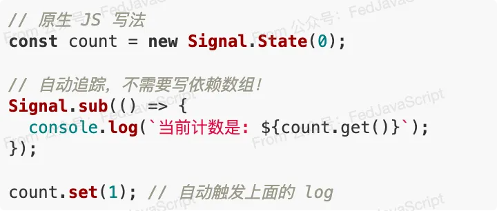 性能优越:原生引擎实现的 Signal,比任何第三方库都要快几倍以上体积为 0:不再需要打包几百 KB 的框架代码有人说:“Signal 是 JS 语言的倒退,它让代码变得不可预测。”也有人说:“React Hooks 才是反人类的设计,原生 Signal 拯救了前端开发者的发际线。”