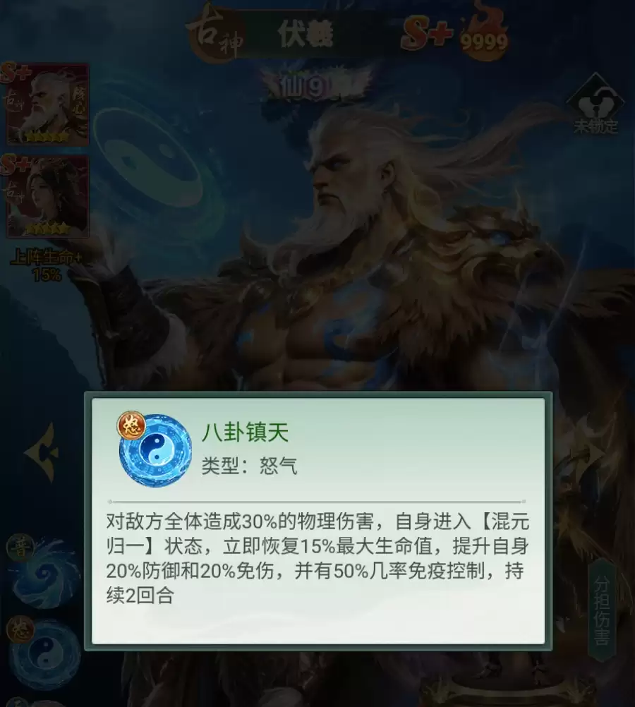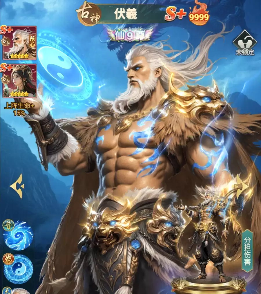 而且,一旦伏羲突破到了9星,伏羲还能在战斗中保护与自己相邻的队友,帮助他们承担一部分所受到的普攻伤害,避免队友的血量被打到比较低的危险线内,减轻队中治疗角色的回血压力。若是伏羲升到了真仙3重,那么这一分摊伤害的效果将对所有伤害都生效,不管敌人是用怒气技还是普攻对伏羲的相邻队友造成伤害,伏羲都可为队友进行伤害分担。此外,真仙1重时,伏羲还能根据己方队伍中古神角色的数量,令自己获得额外的减伤效果,这也意味着伏羲更适合与古神阵营中的角色一起组队。