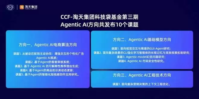2026年3月26日,CCF联合淘天集团正式发布“CCF-淘天集团科技袋基金”第三期,共十个课题,聚焦Agentic AI方向,申报截止时间:2026年4月26日24:00(北京时间),欢迎CCF会员积极申报。
