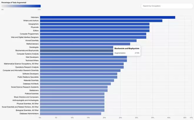 按AI岗位暴露程度的职业排名:受AI影响最大与最小的职业。(图片来源:Digital Planet)