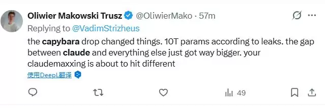 用户Oliwier Makowski Trusz则认为Capybara的发布改变了格局。根据泄露信息,参数量达到10万亿。Claude 与其他所有模型之间的差距刚刚被大幅拉开。