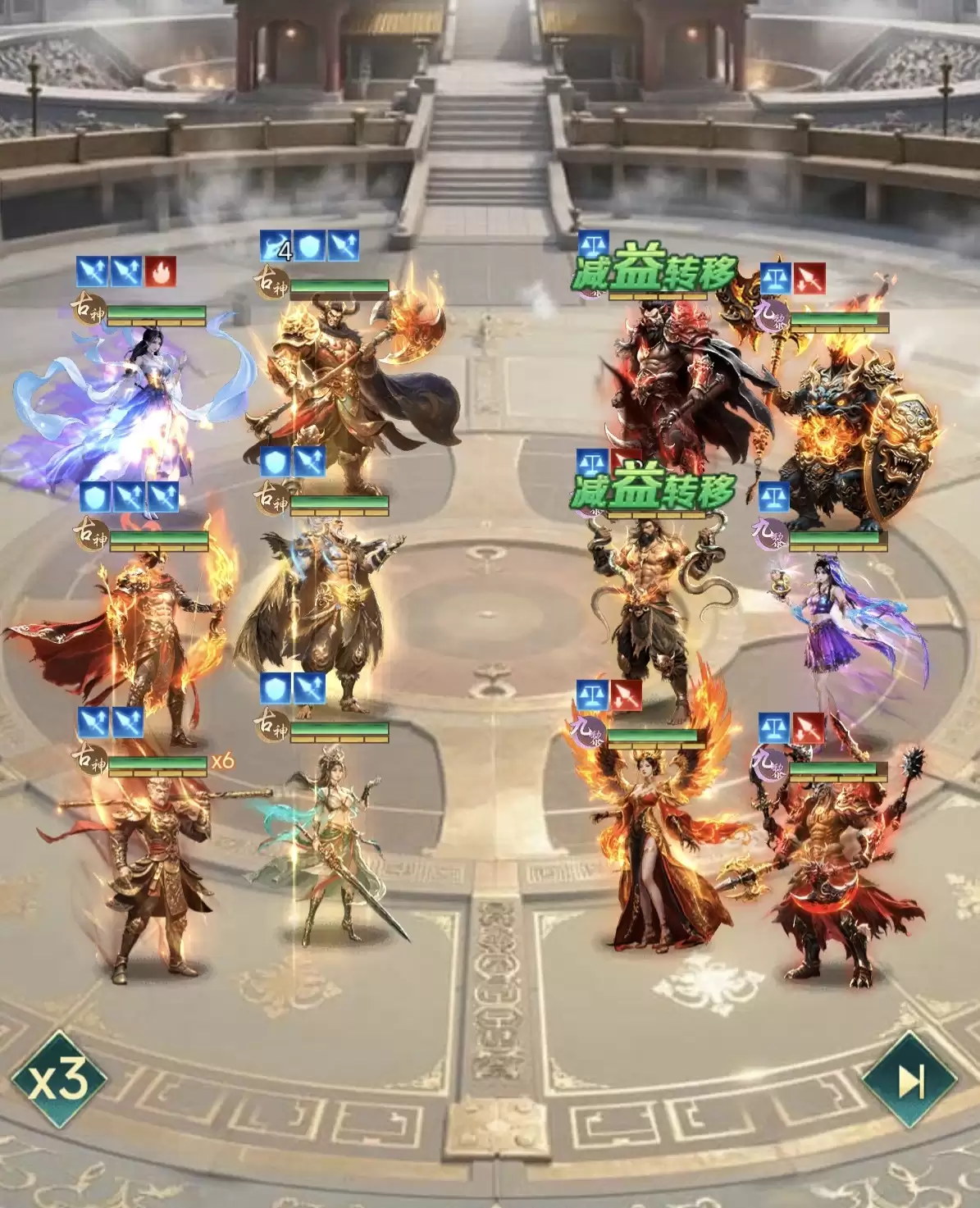 在天赋方面达到九星时,会有质变的效果,此时敌方每释放一次范围攻击,平天大圣就可以叠加一层状态,当叠加到5层时,可以将所有状态消耗掉,释放蛮牛咆哮,同排友方的防御大幅度提升。此时平天大圣对整个队伍的生存加成更加明显,真正实现了增防降攻的作用,是现在游戏中非常好用的前排角色之一。搭配方面推荐走古神切后队的流派,具体组成是前排平天大圣、伏羲和九天玄女,后排嫦娥、后羿和齐天大圣。这套阵容中全部都是由古神阵营角色组成,而且获取起来也比较简单,齐天大圣更是首充直接就能拿下。