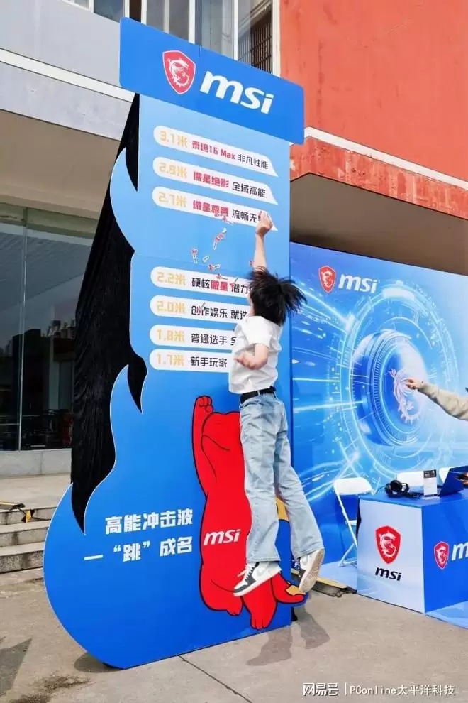 超酷的微星主题背景墙吸引了无数同学前来拍照,发布朋友圈,争做校园最靓的科技icon。旁边的“摸高挑战”区域更是人头攒动,大家纷纷跳起,在释放学业压力的同时,也赢得了精美的礼品。