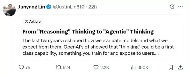 3月26日晚,作为前阿里通义千问 Qwen 负责人,林俊旸这篇题为《从“推理式思考”到“智能体式思考”》(From "Reasoning" Thinking to "Agentic" Thinking)的文章,是他从阿里离职后首次公开发表的长文。