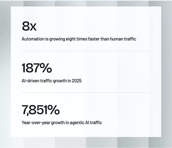 网络安全公司 HUMAN Security 在 3 月 26 日发布了《2026 年 AI 流量与网络威胁基准报告》,基于其防御平台在 2025 年处理的超过一千万亿次(quadrillion)交互数据,给出了一组惊人的数字:2025 年,互联网上的自动化流量同比增长了 23.51%,大约是人类流量增速(3.10%)的 8 倍。其中,AI 驱动的流量从 1 月到 12 月增长了 187%,月均规模接近翻了三倍。来自 AI Agent 和 Agent 浏览器的流量同比暴涨了 7,851%。