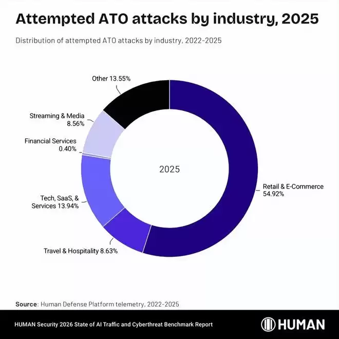 虚假账户创建从 2024 年到 2024 年增长了 259%,2025 年又增长了 89%。HUMAN 的威胁追踪系统在 2025 年全年识别出超过 75 万个不同的威胁画像(threat profile),其中仅抓取攻击就占了 62%。