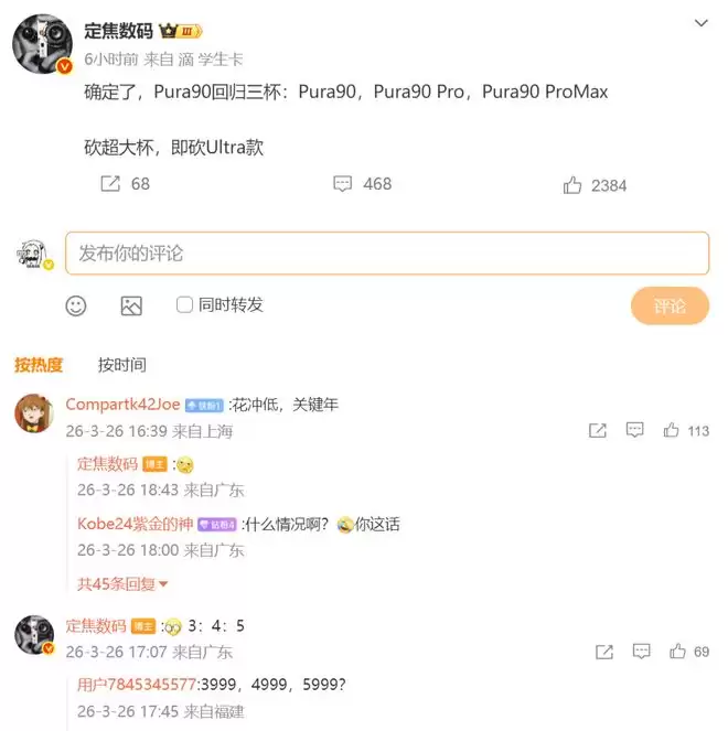 但没有想到的是,近期却有博主透露华为Pura 90系列将取消前代的Ultra款,回归三杯路线:Pura 90、Pura 90 Pro、Pura 90 Pro Max。